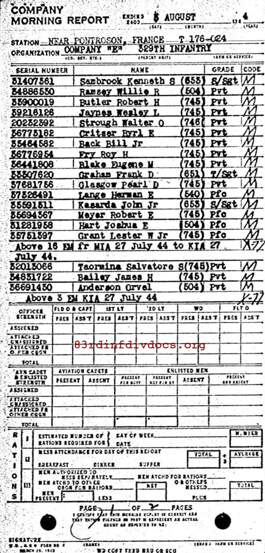| Private Critser was a member of E Company. The morning report for August 1, 1944 on page 1 lists his status changed to missing in action on July 27, 1944. Page 10, for August 3, 1944, lists his status changed from missing in action to killed in action on July 27, 1944. Page 1 and 10 can be seen here. |