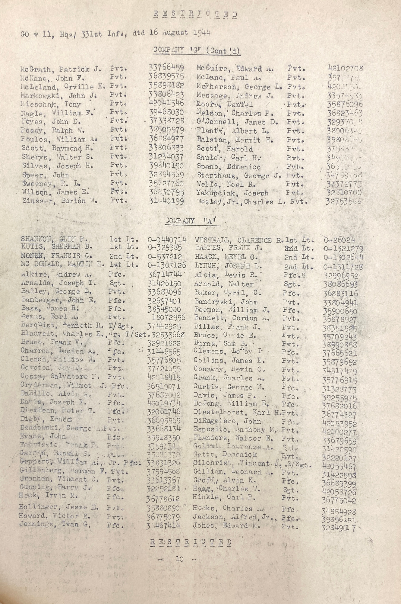 | Unit | A Company, 331st Infantry Regiment, 83rd Infantry Division |