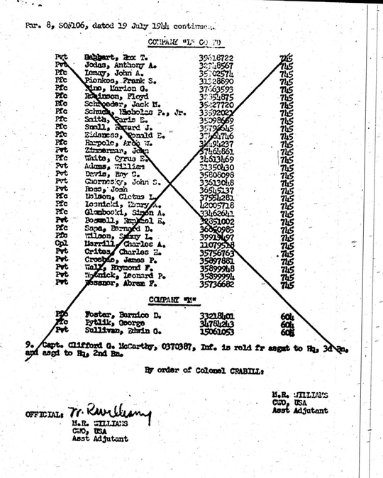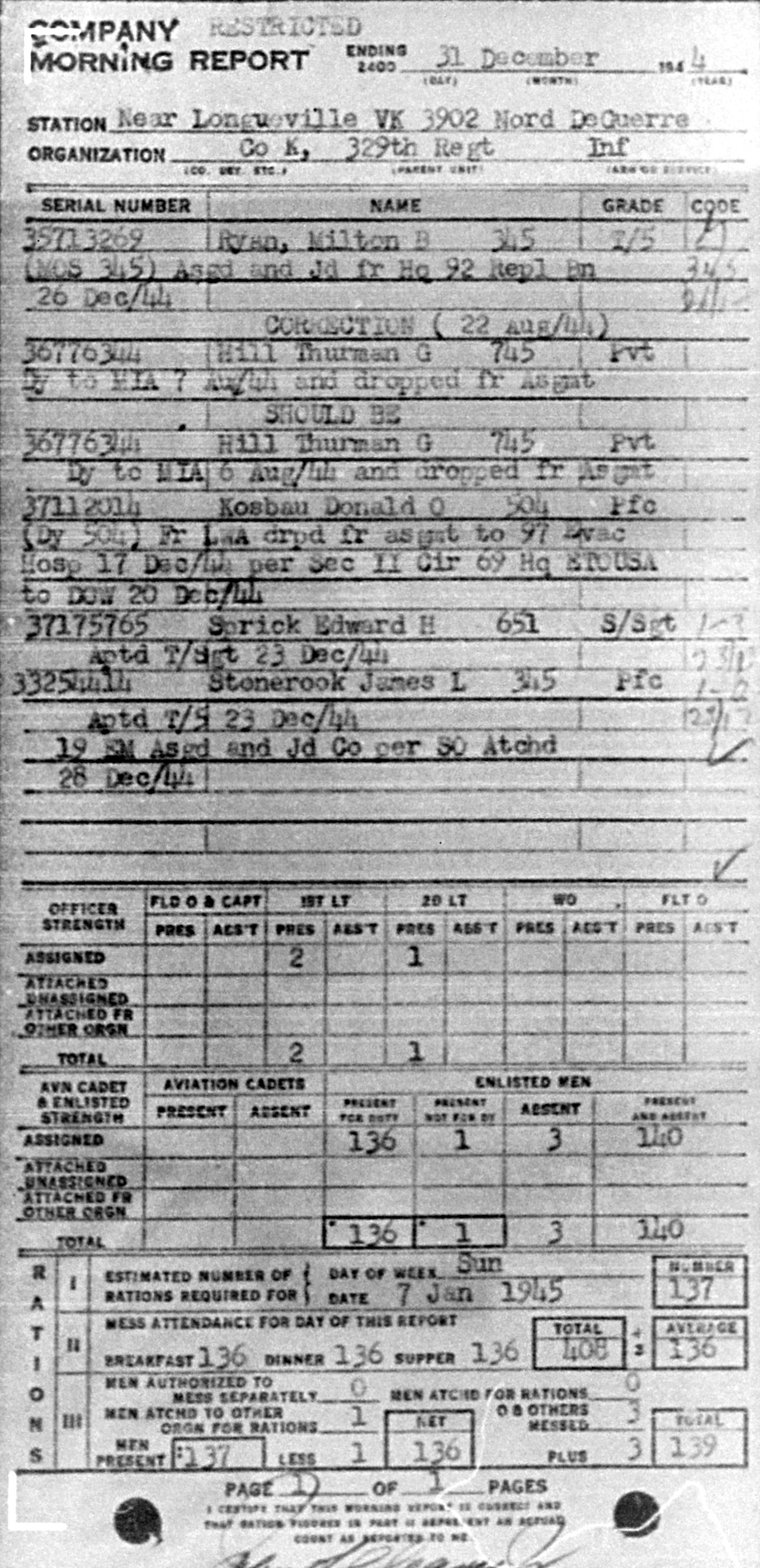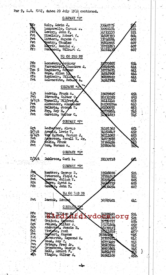 | Private Hill was a member of K Company. The morning report for August 22, 1944 on page 48 lists him as missing in action on August 7, 1944. The page can be seen below. |