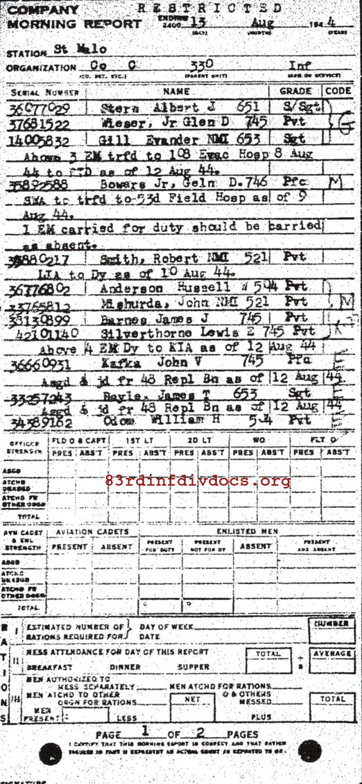 | 1944-08-13 | PVT | Killed in action on August 12, 1944 | 504 | C / 330 | view page |