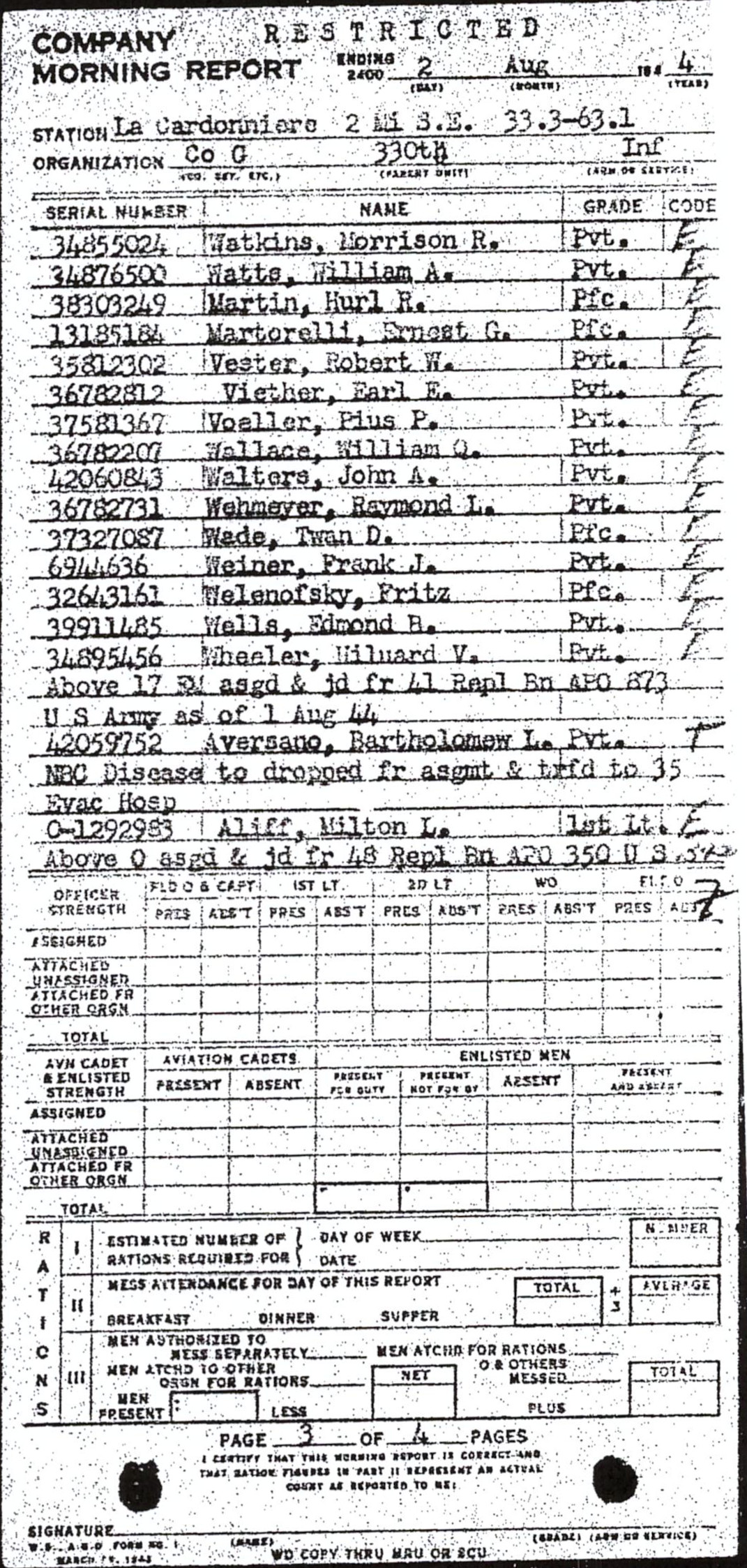 | Sergeant Viether was a member of G Company. The morning report for August 2, 1944 on page 8 lists him joining the unit from the 41st Replacement Battalion on August 1, 1944. Page 32, for August 18, 1944, lists his promotion to Private First Class on August 17, 1944. The pages can be seen below. |