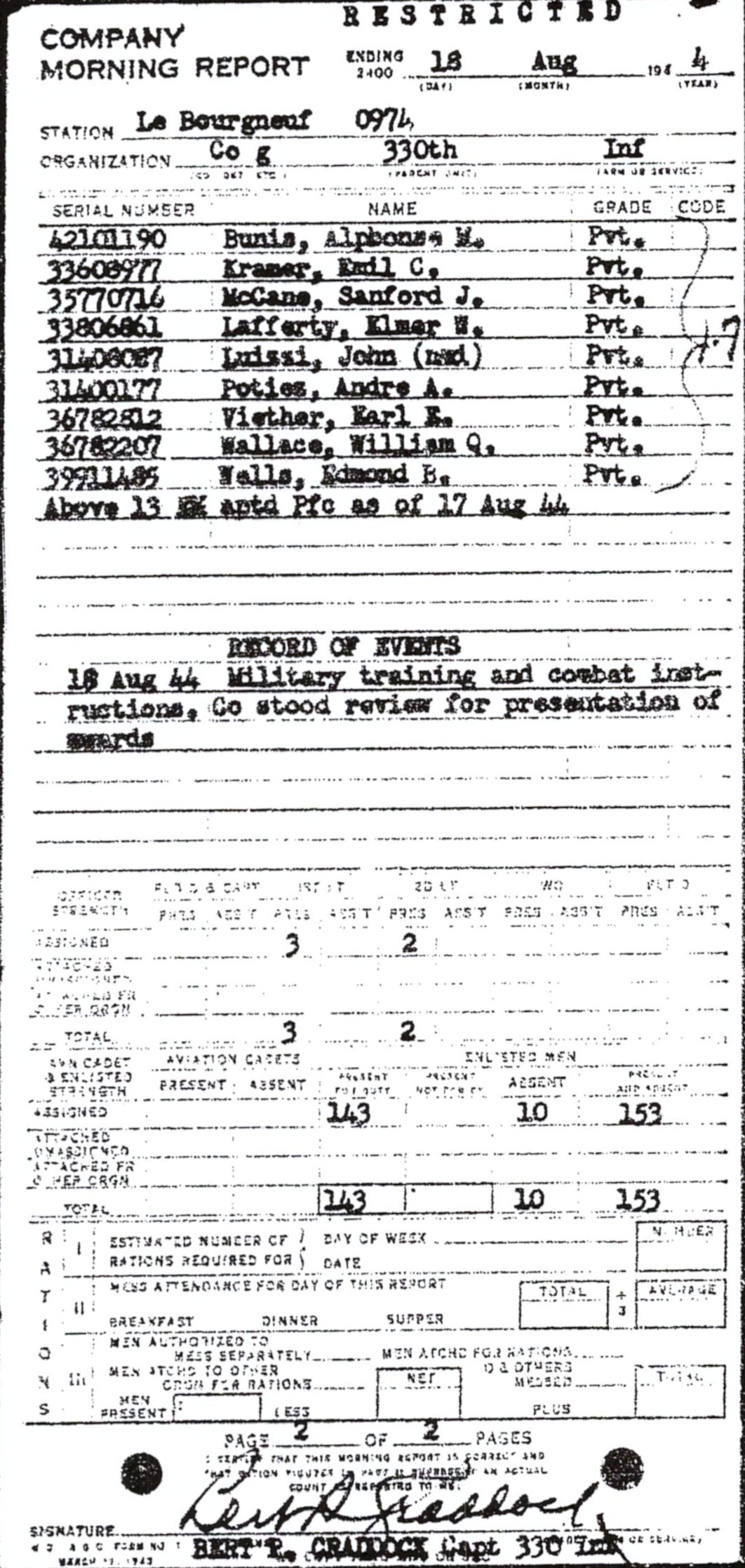 | 1944-08-02 | PVT | Assigned and joined from 41st Replacement Battalion as of August 1, 1944 | G / 330 | view page | |