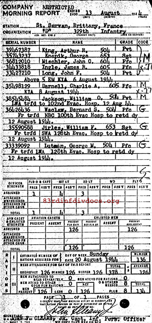 | Private First Class Mischler was a member of D Company. The morning report for July 23, 1944 on page 35 lists him joining D Company. Page 35 can be seen here as well.