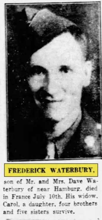 | According to the memoirs of Frank Monan, Co. A 331st, Pvt. Frederick Waterbury was a member of Company A. The 331st Casualty Report (page 3, #102) for 1944 lists Pvt. Waterbury as member of A Co.