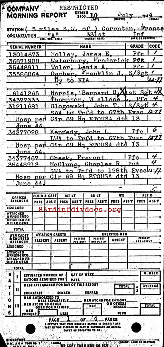 | 1944-07-10 | PVT | Killed in action on July 10, 1944 | A / 331 | view page | |