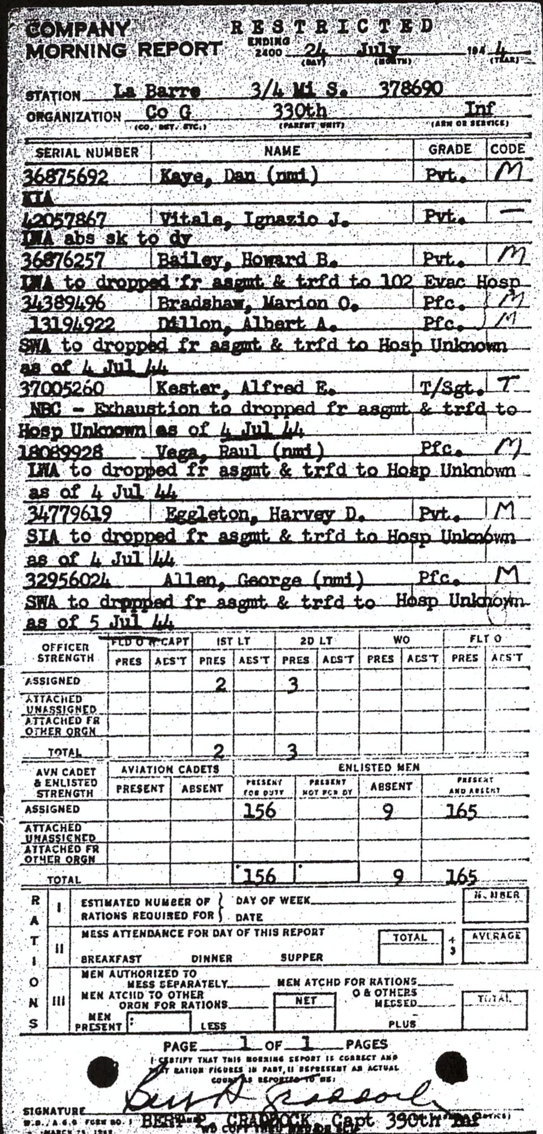 | Private Kaye was a member of G Company. The morning report for July 11, 1944 on pages 20 and 21 list him joining the unit from the 48th Replacement Battalion on July 7, 1944. Page 46, for July, 24, 1944, lists him as killed in action. The pages can be seen below. |