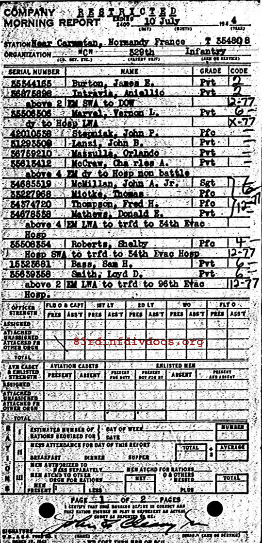 | 1944-07-10 | PVT | Died of wounds on July 10, 1944, initial wounds not previously reported | C / 329 | view page | |