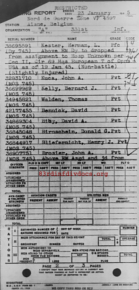 | 1945-01-23 | PVT | Assigned and joined from 92nd Replacement Battalion as of January 23, 1945 | 745 | A / 331 | view page |