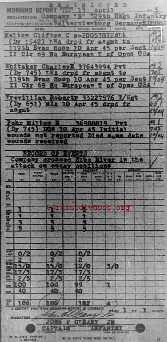 | Unit | B Company, 329th Infantry Regiment, 83rd Infantry Division |