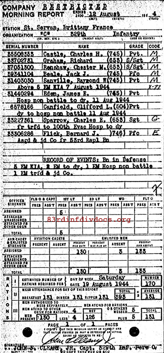 | Staff Sergeant Renshaw was a member of C Company. The morning report for August 12, 1944 on page 22 shows him killed in action on August 7, 1944. Page 22 can be seen here as well. |