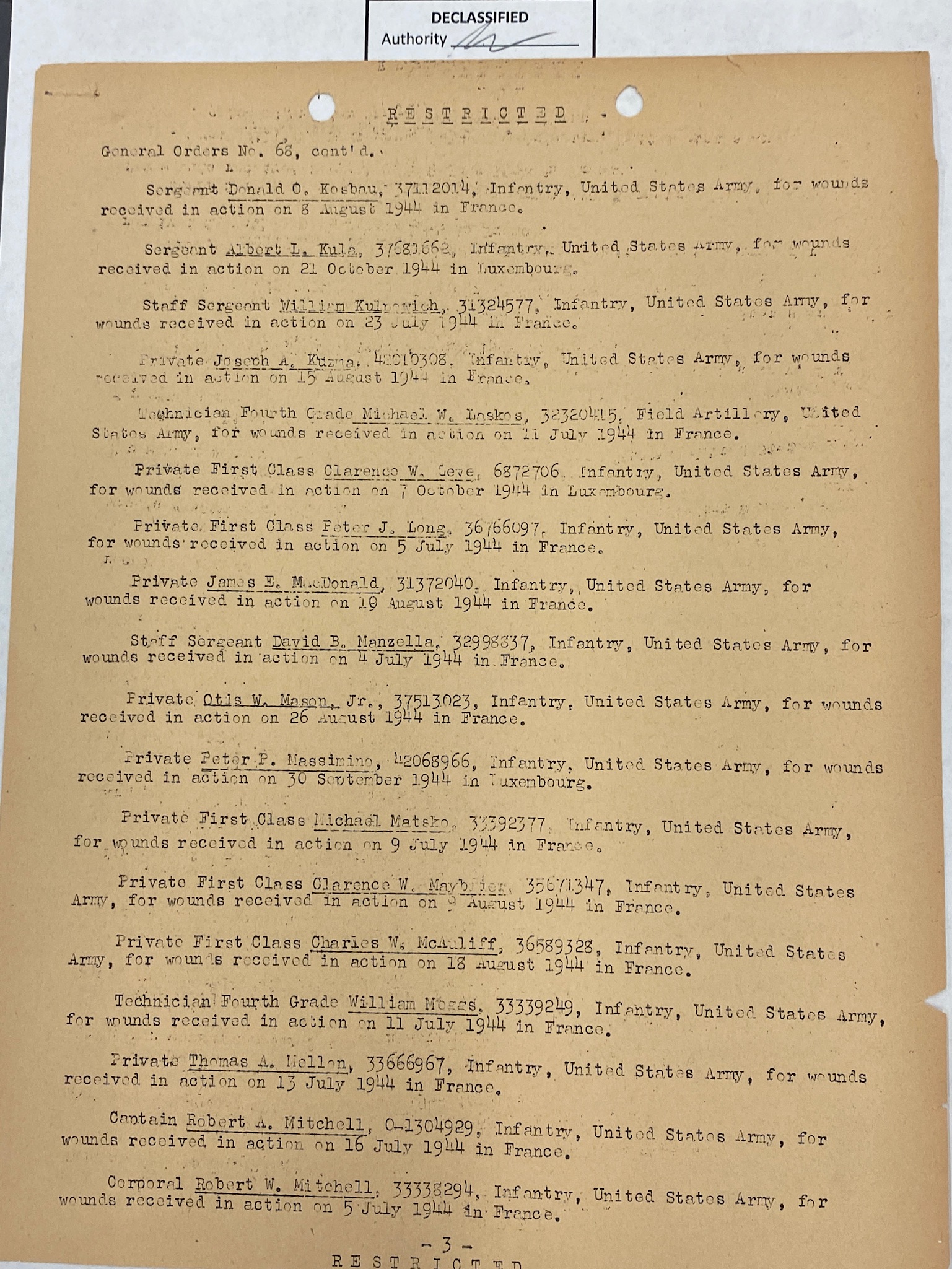 | 1944-08-08 | PFC | Lightly wounded in action and transferred to 108th Evacuation Hospital on August 8, 1944 | 504 | K / 329 | view page |