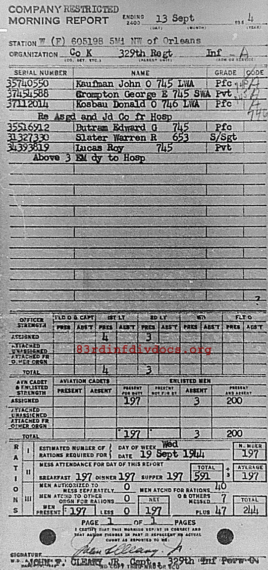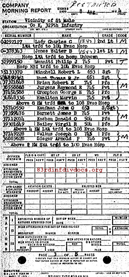 | Private First Class Kosbau was a member of K Company. The morning report for August 8, 1944 on page 19 lists him as lightly wounded in action and transferred to the 108nd Evacuation Hospital. The relevant page can be seen below. Since we have no later documents we assume that Private First Class Kosbau died while serving in K Company. |
