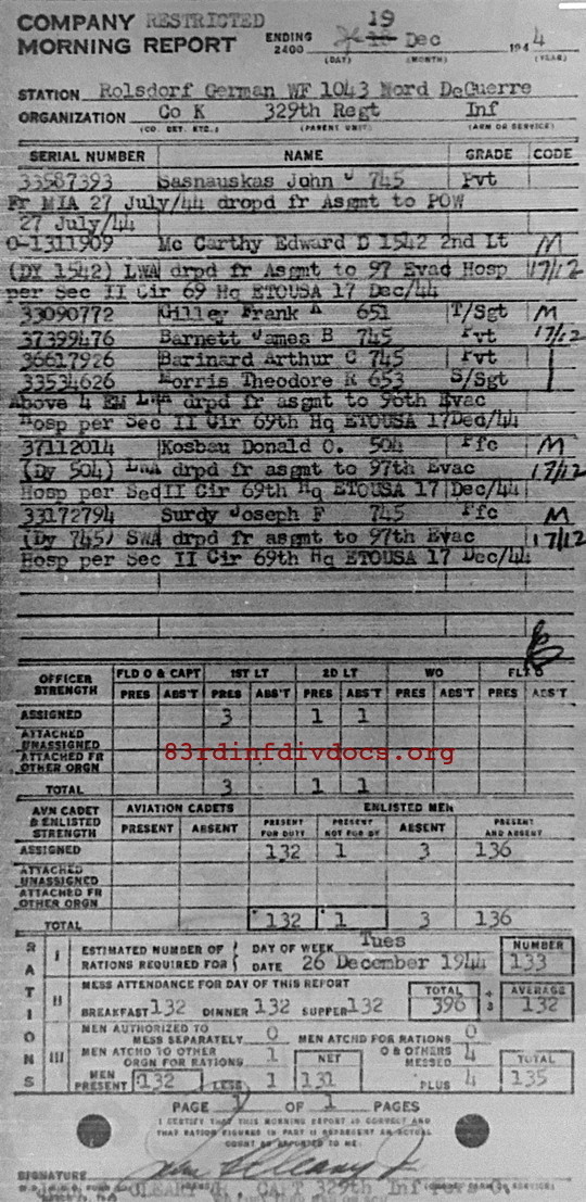 | Unit | K Company, 329th Infantry Regiment, 83rd Infantry Division |