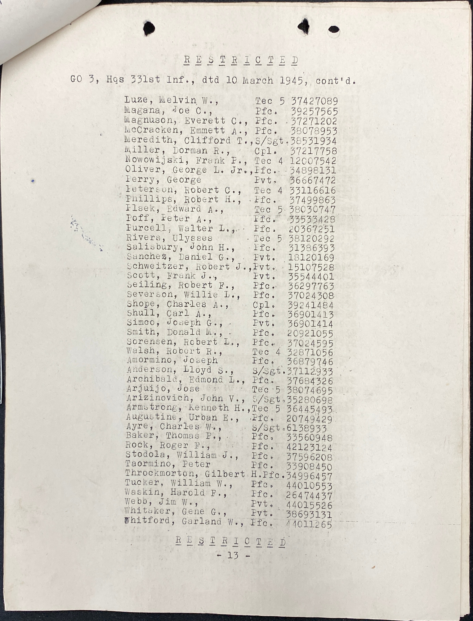 | 1945-05-13 | PFC | Killed in action on April 13, 1945, which corrects MR of April 20, 1945 | 745 | I / 331 | view page |