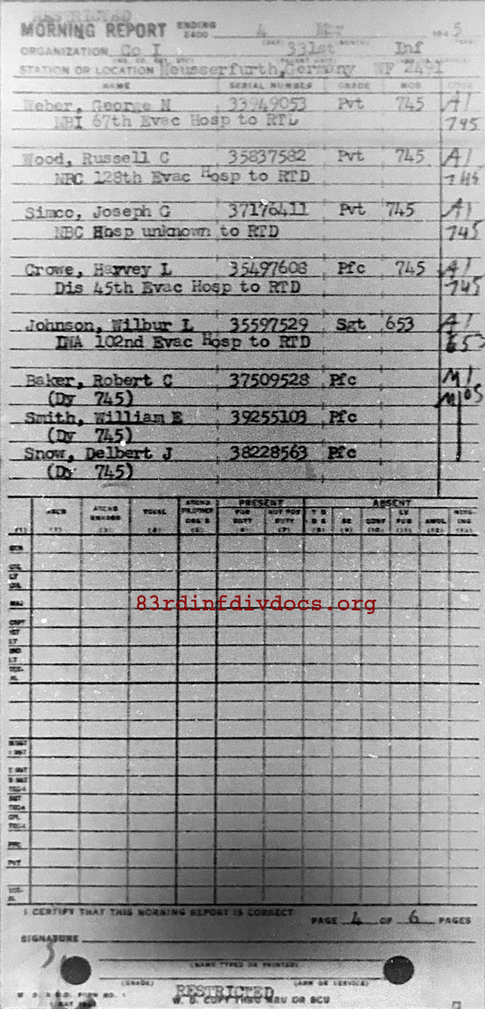 | 1945-01-27 | PVT | Non battle casualty and transferred to unknown hospital on January 21, 1945 | 745 | K / 331 | view page |