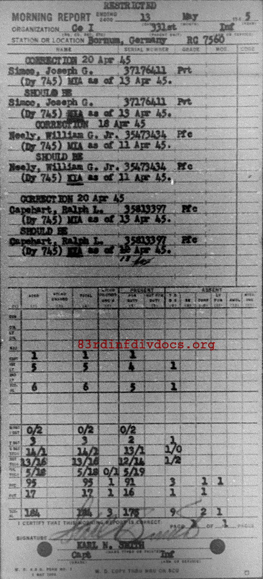| 1945-04-20 | PVT | Missing in action as of April 13, 1945 | 745 | I / 331 | view page |