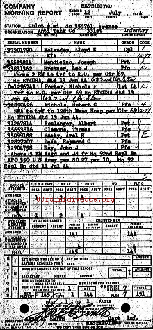 | 1944-07-12 | CPL | Killed in action on July 12, 1944 | ATCO / 331 | view page | |