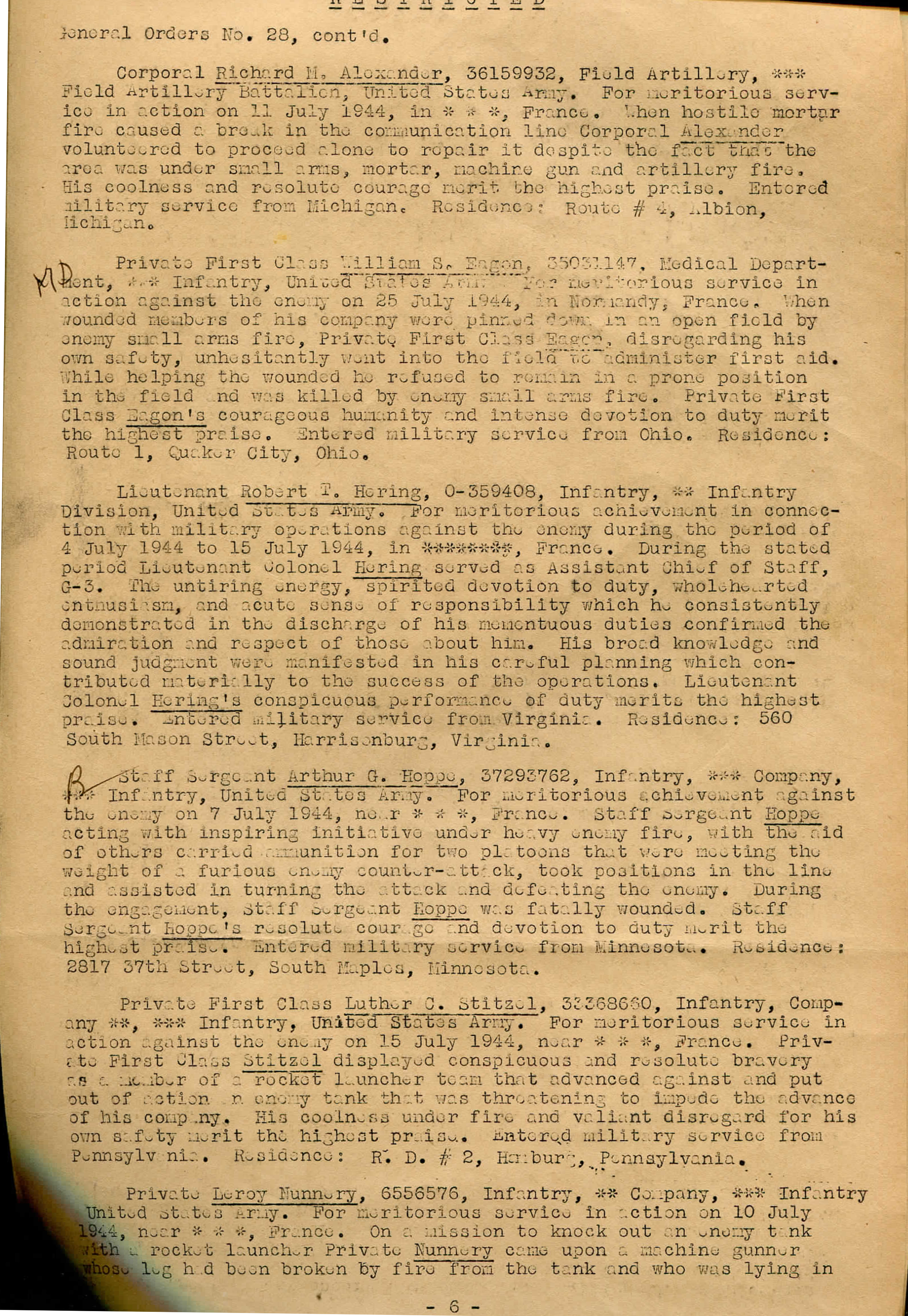 For meritorious achievement against the enemy on 7 July 1944, near ***, France. Staff Sergeant Hoppe acting with inspiring initiative under heavy enemy fire, with the aid of others carried ammunition for two platoons that were meeting the weight of a furious enemy counter-attack, took positions in the line and assisted in turning the attack and defeating the enemy. During the engagement, Staff Sergeant Hoppe was fatally wounded. Staff Sergeant Hoppe's resolute courage and devotion to duty merit the highest praise. |