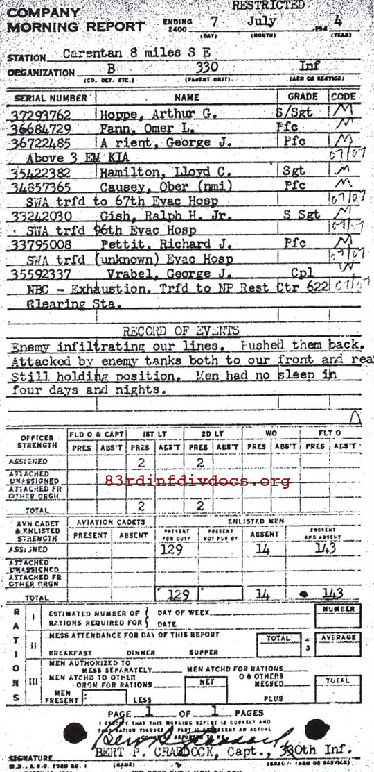| 1944-07-07 | SSGT | Killed in action on July 7, 1944 | B / 330 | view page | |
