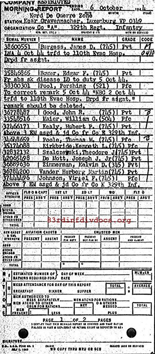 | 1944-10-06 | PFC | Transferred to A Company, 329th Infantry Regiment as of October 6, 1944 | 745 | K / 329 | view page |
