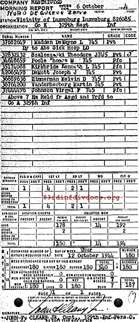 | 1944-10-06 | PFC | Assigned and joined from K Company, 329th Infantry Regiment as of October 6, 1944 | 745 | A / 329 | view page |