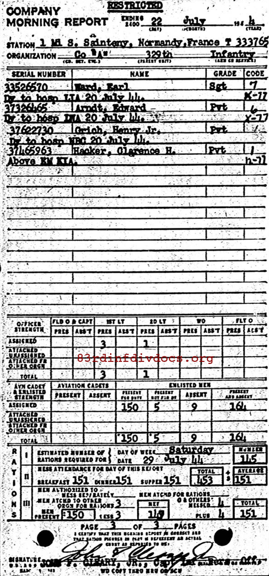 | Private Hacker was a member of A Company. The morning report for July 22, 1944 on page 60 lists him as killed in action. The page can be seen below. |