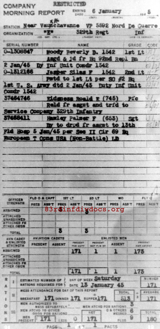 | 1945-01-04 | SGT | Assigned and joined from 92nd Replacement Battalion as of January 2, 1945 | 653 | E / 329 | view page |