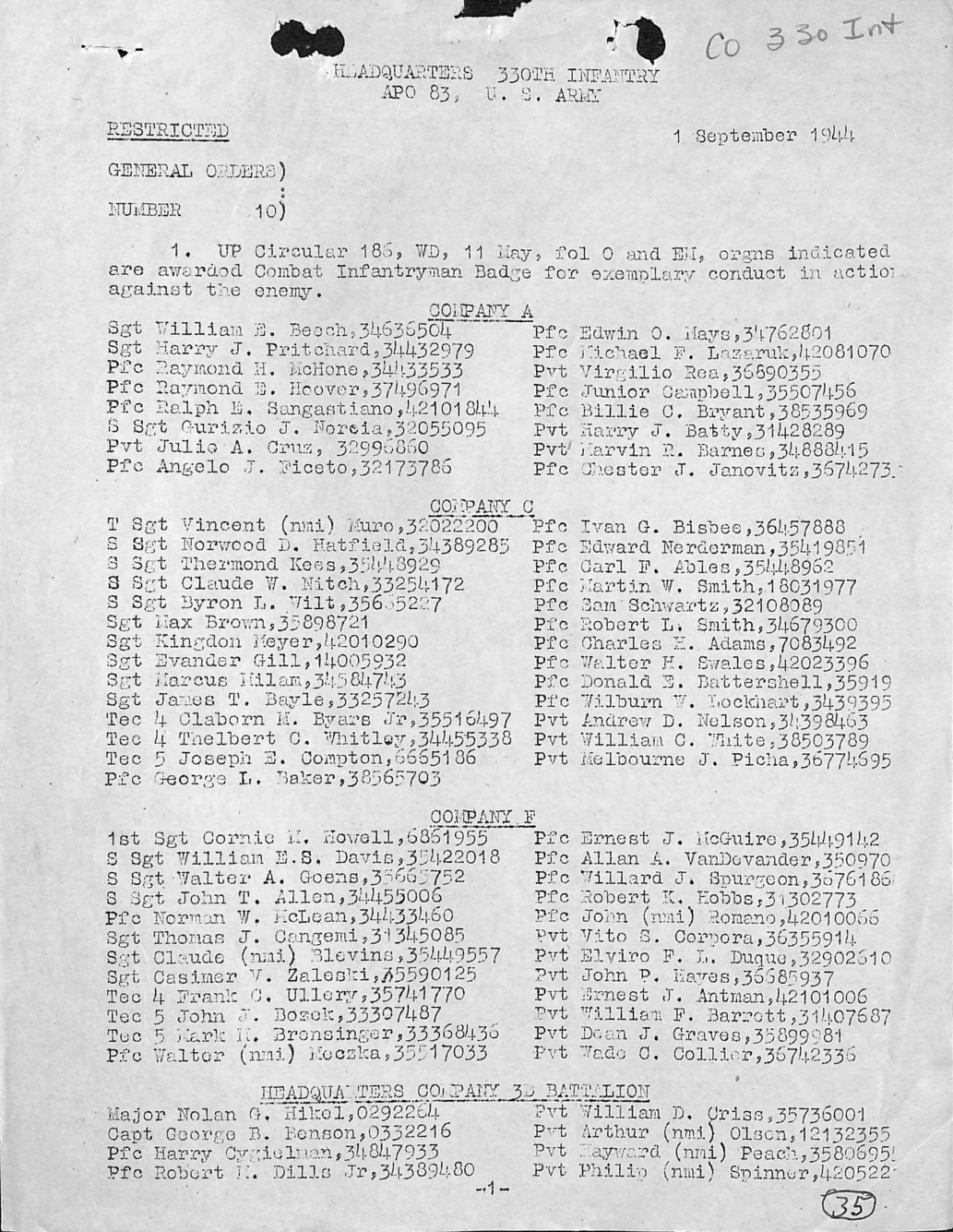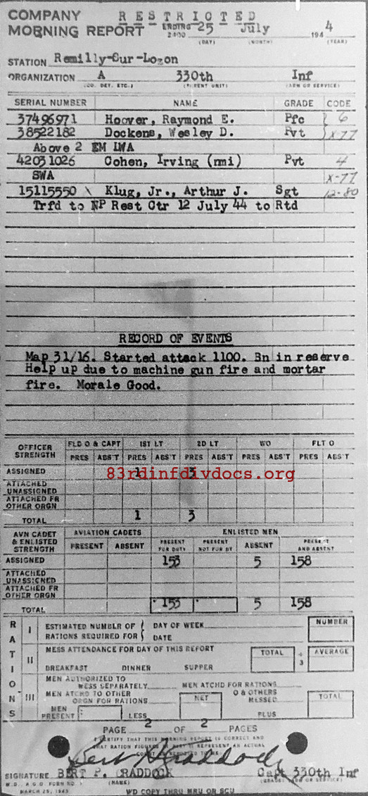 | Unit | A Company, 330th Infantry Regiment, 83rd Infantry Division |