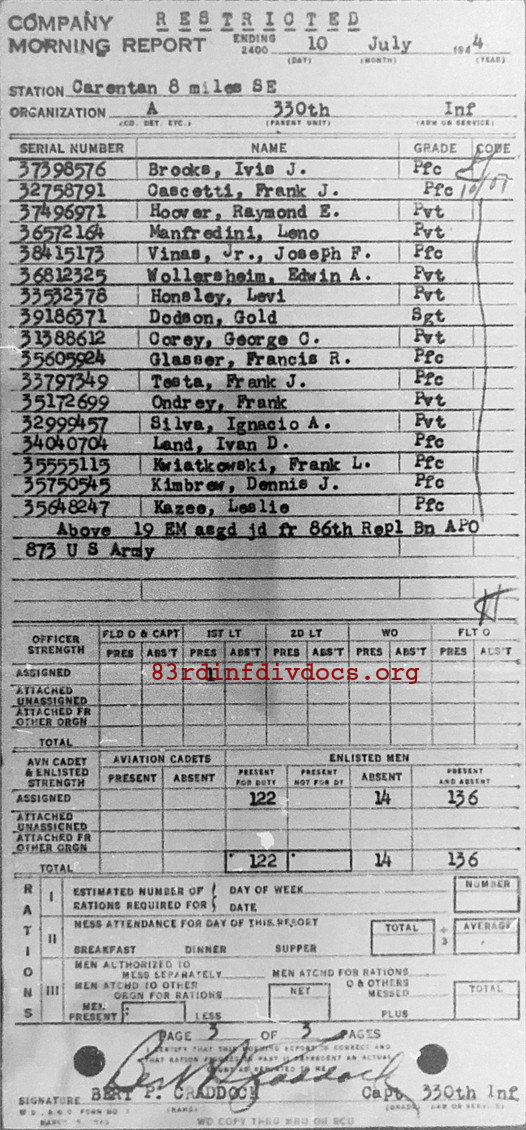 | 1944-07-10 | PVT | Assigned and joined from 86th Replacement Battalion as of July 10, 1944 | A / 330 | view page | |