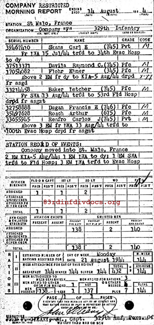 | Private First Class Davila was a member of F Company. The morning report for August 14, 1944 on page 25 lists him as killed in action on August 5, 1944. The page can be seen below. |