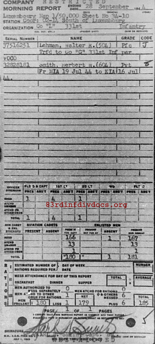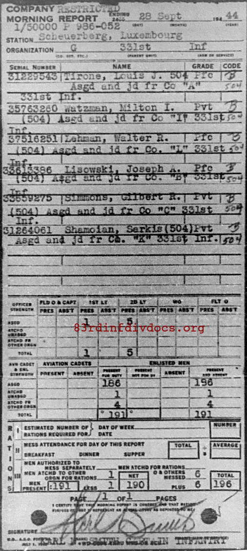 | 1944-09-28 | PFC | Transferred to G Company, 331st Infantry Regiment as of September 28, 1944 | 504 | L / 331 | view page |