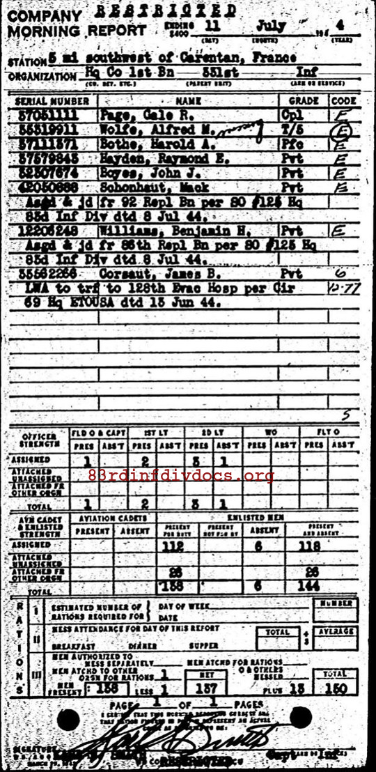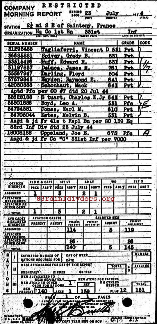 | 1944-07-11 | PVT | Assigned and joined from 92nd Replacement Battalion as of July 11, 1944 | HQCO1BN / 331 | view page | |