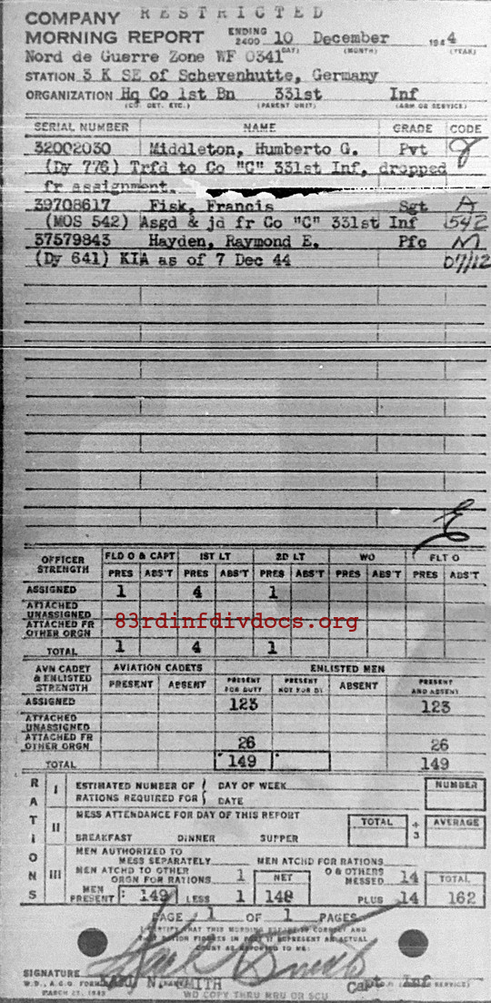 | The 331st Casualty Report (page 2, #50) for 1944 lists Pfc. Hayden as member of 1st Battalion but not a specific company. Also check the excellent website of Jelle Thys, who has adopted the grave of Raymond Hayden, here. |