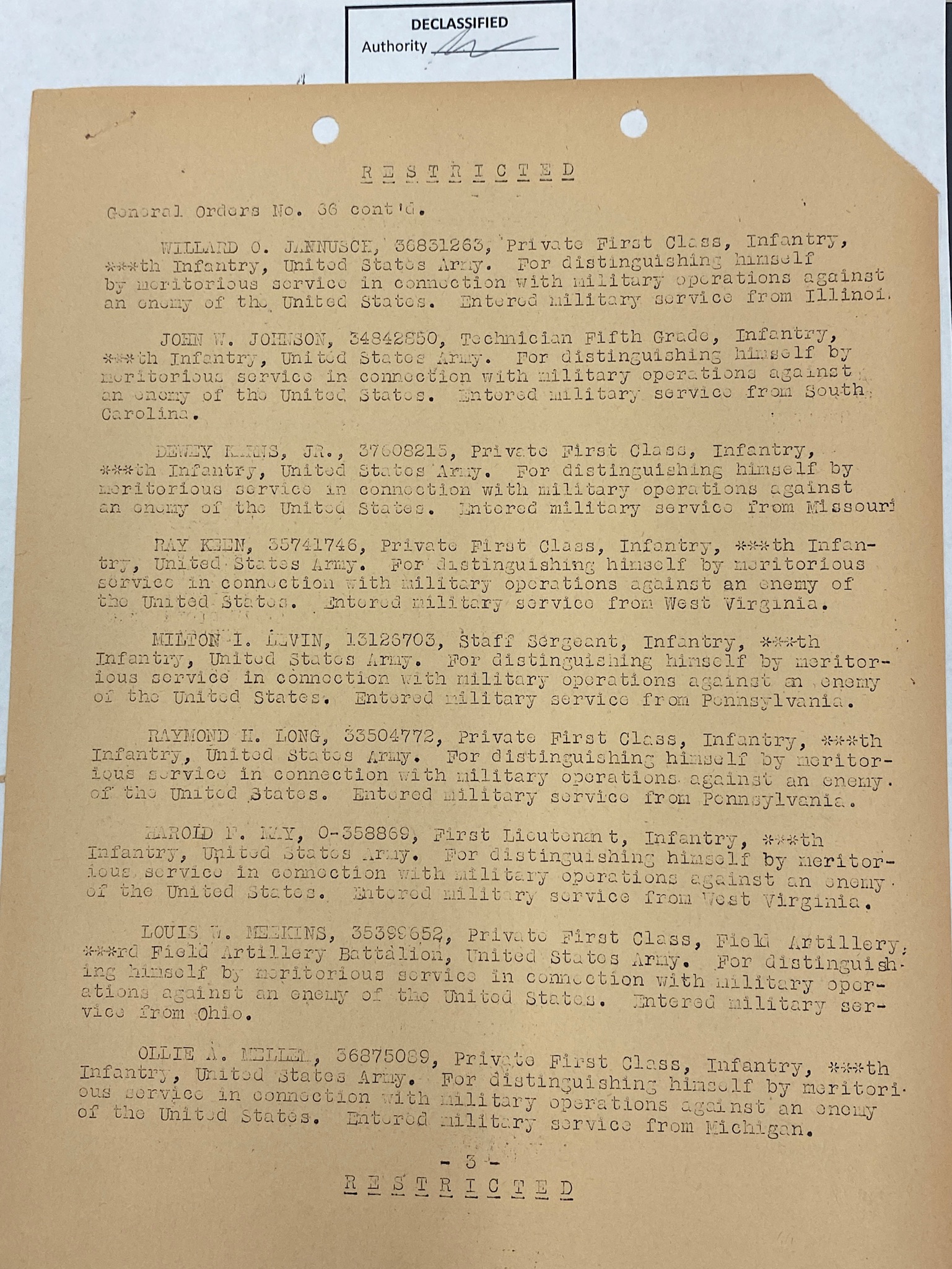 | Listed in 330th Infantry Regiment Casualties and Awards: Bronze Star Medal for Meritorious Service in General Order 66 as a Private First Class in HQ2BN/330 | 85 | ||||