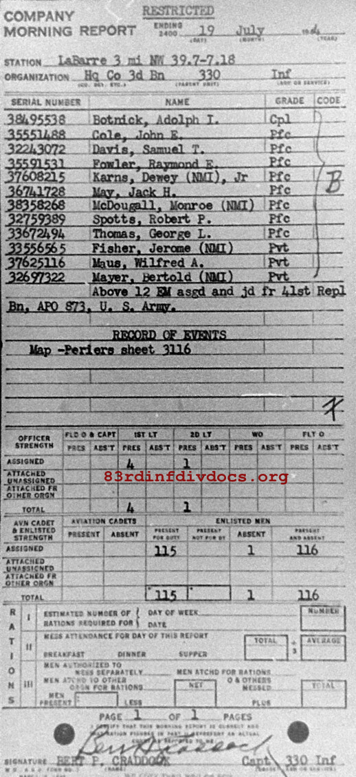 | 1944-07-19 | PFC | Assigned and joined from 41st Replacement Battalion as of July 19, 1944 | HQCO3BN / 330 | view page | |