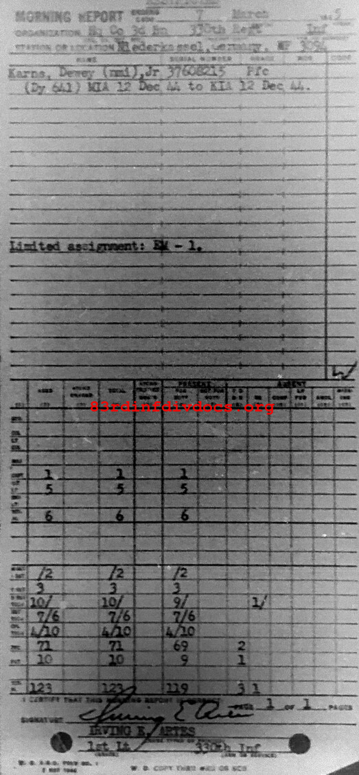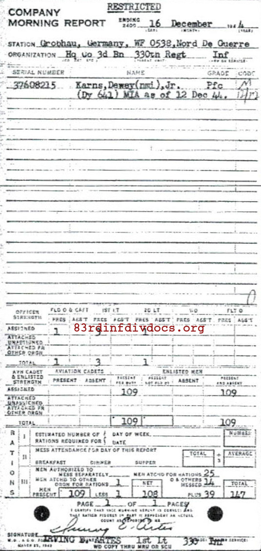 | Private First Class Karns was a member of the Headquarters Company, 3rd Battalion. The morning report for December 16, 1944 on page 17 lists his status changed to missing in action as of December 12, 1944. The page can be seen below. |