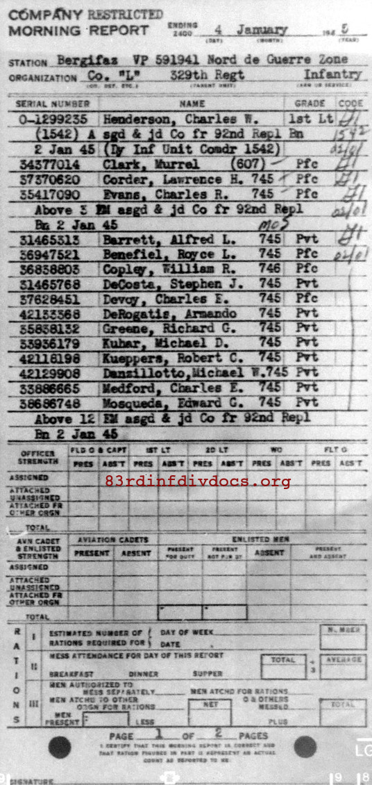 | 1945-01-04 | PFC | Assigned and joined from 92nd Replacement Battalion as of January 2, 1945 | 745 | L / 329 | view page |