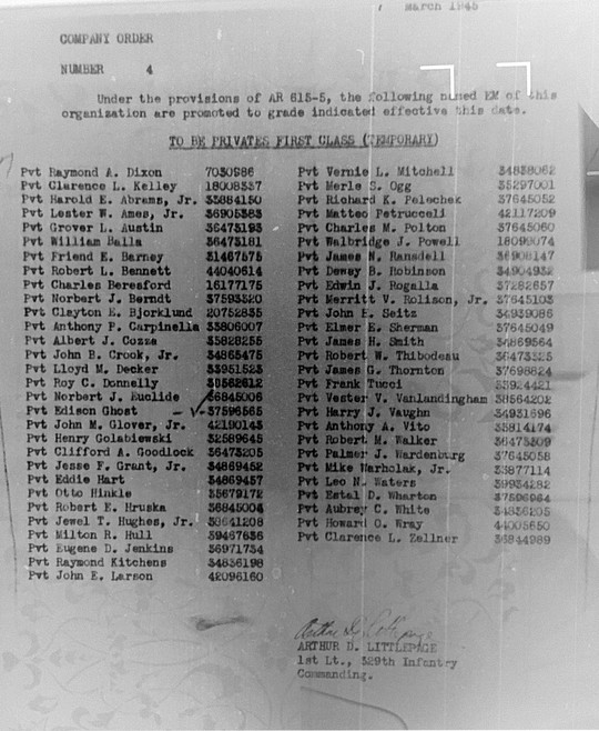 | 1945-03-07 | PVT | Promoted to Private First Class as of March 7, 1945 | G / 329 | view page | |
