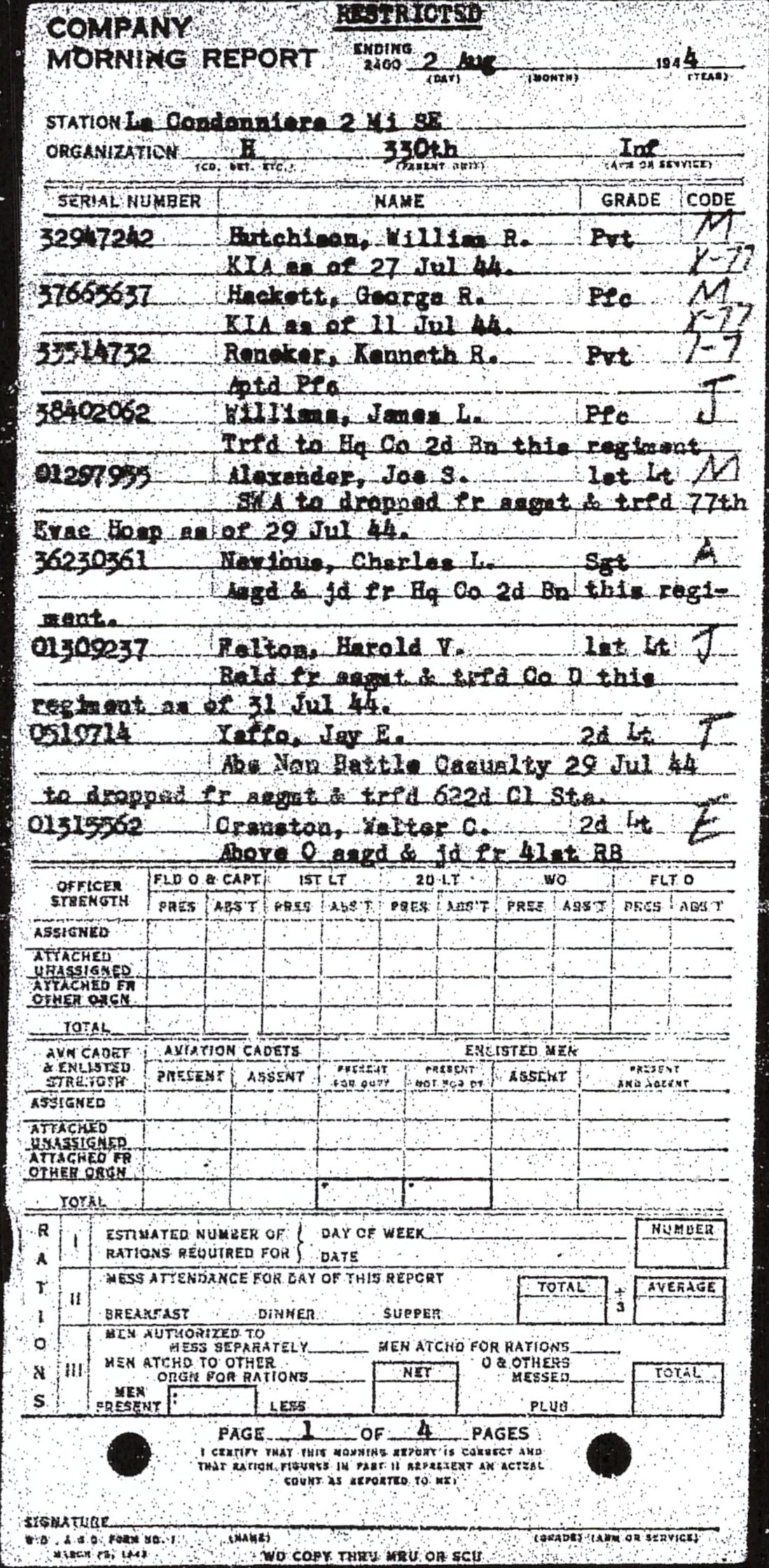 | 1944-07-10 | PFC | Assigned and joined from 48th Replacement Battalion as of July 7, 1944 | H / 330 | view page | |