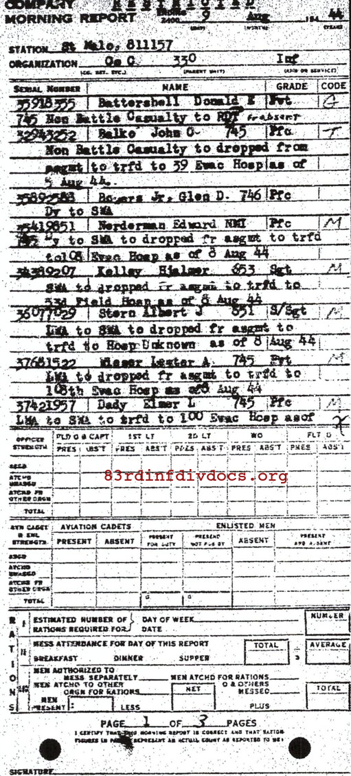 | 1944-08-09 | PVT | Lightly wounded in action and transferred to 108th Evacuation Hospital on August 8, 1944 | 745 | C / 330 | view page |