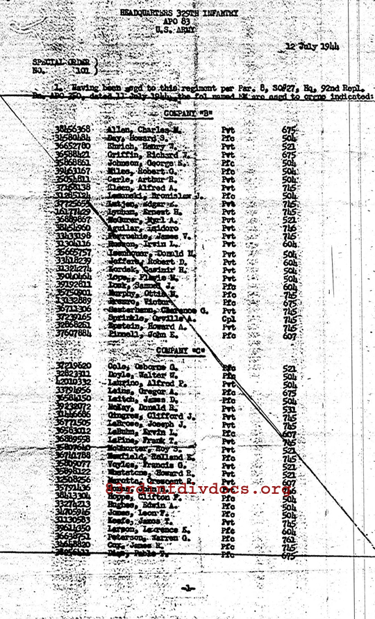 | 1944-08-01 | PFC | Promoted to Sergeant, duty changed to Squad Leader (653) as of August 1, 1944 | F / 329 | view page | |