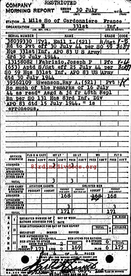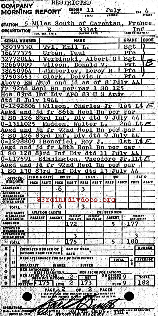 | Private First Class Tyl was a member of E Company. The morning report for July 11, 1944 on page 13 lists him joining the unit from the 92nd Replacement Battalion on Jul 8, 1944. Page 49, for July 30, 1944, lists a promotion to Staff Sergeant on July 15, 1944 and reassignment to Squad Leader (MOS653). Page 52, for July 30, 1944, lists his demotion to Private on July 30, 1944 with MOS 521.