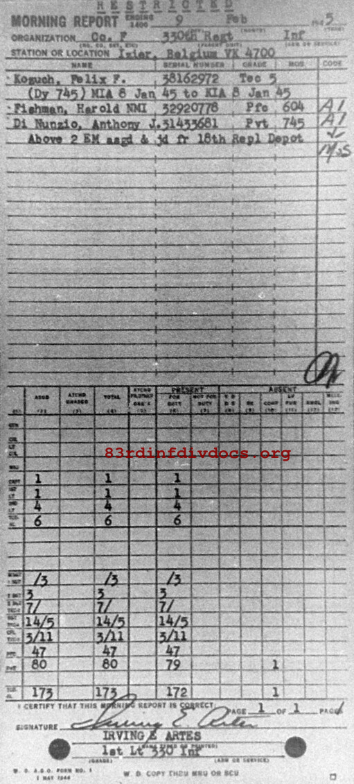 | 1945-01-13 | TEC5 | Missing in action as of January 8, 1945 | 745 | F / 330 | view page |