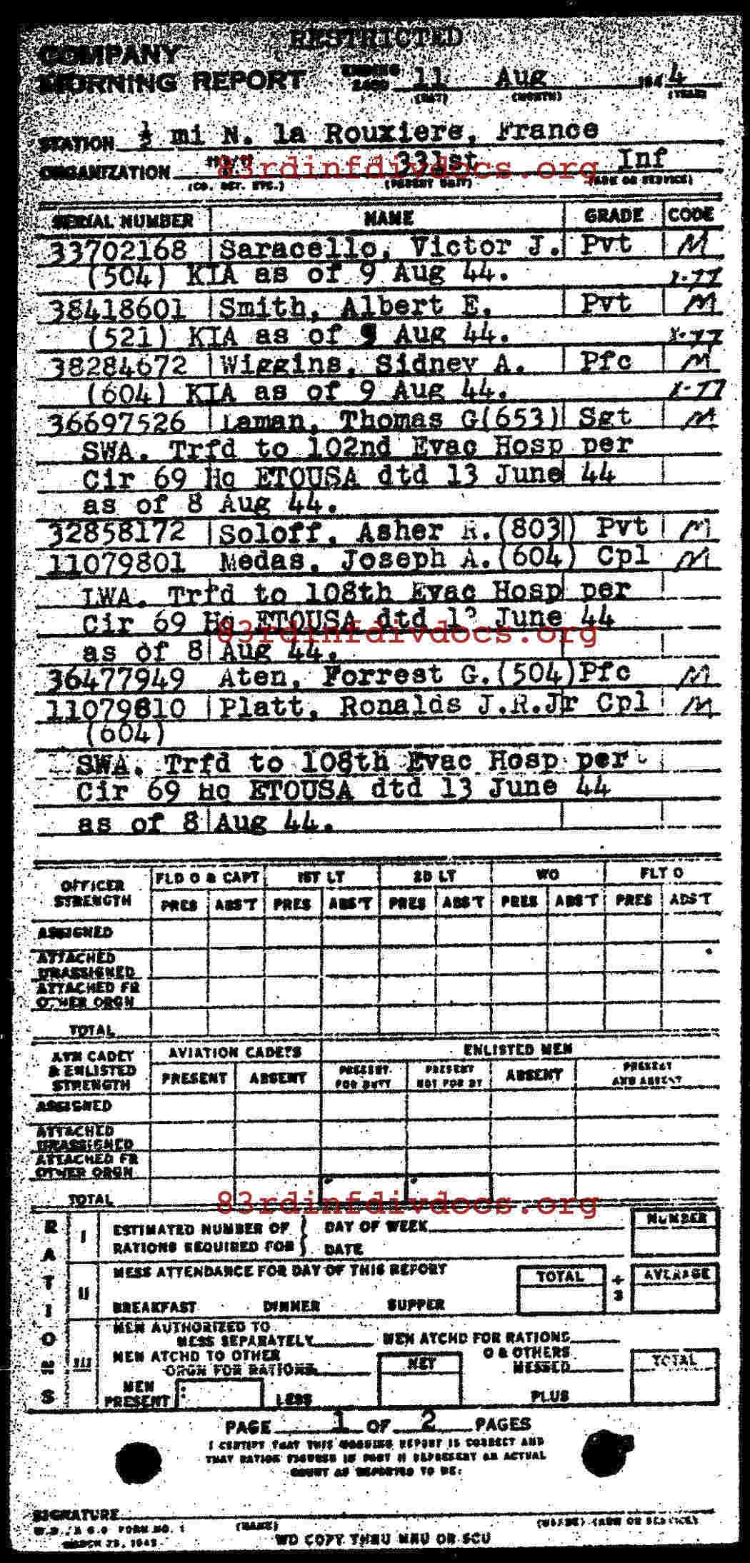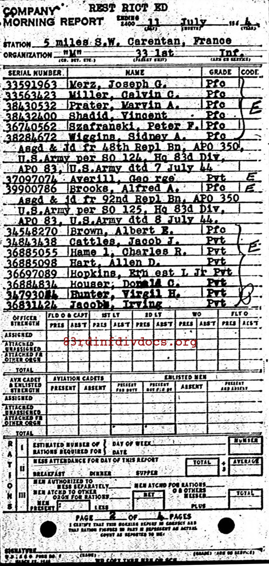 | Private First Class Wiggins was a member of M Company. The morning report for July 11, 1944 on page 15 lists him joining M Company from the 48th Replacement Battalion. The page can be seen below. The 331st Casualty Report (page 3, #120) for 1944 also lists Pfc. Wiggins as member of M Co. |