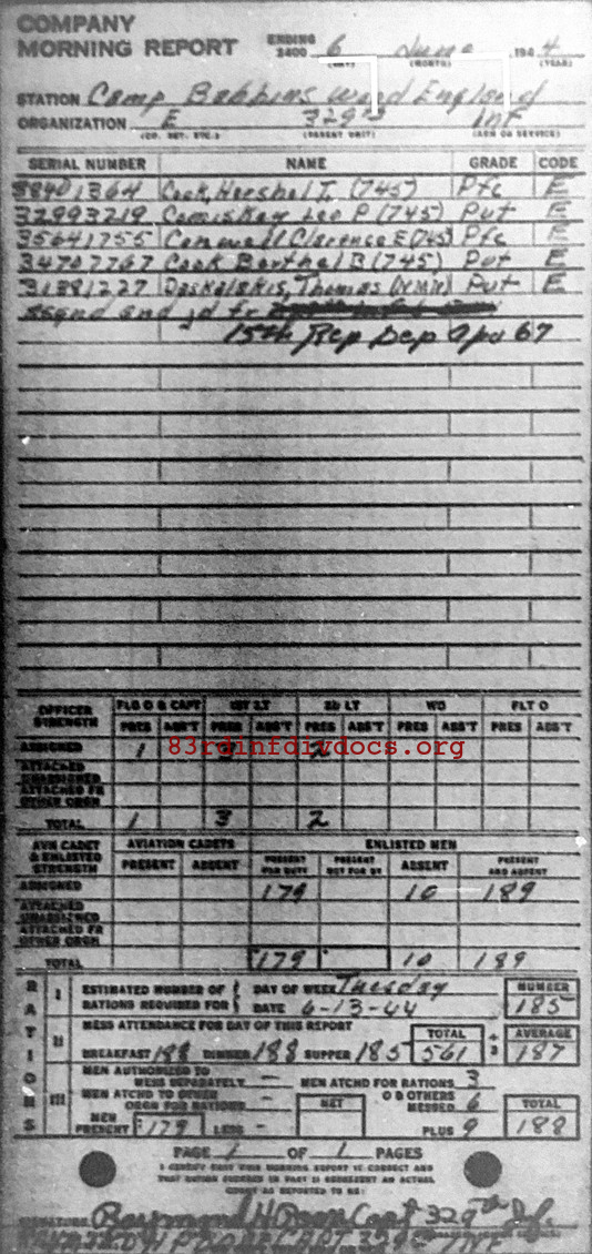 | 1944-06-06 | PFC | Assigned and joined from 15th Replacement Depot as of June 6, 1944 | E / 329 | view page | |