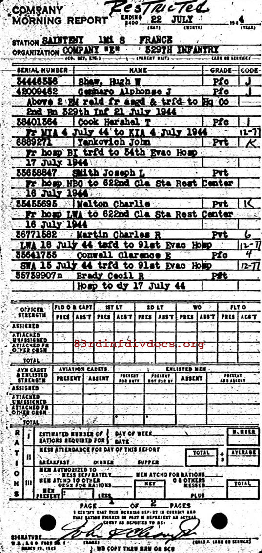 | 1944-07-07 | PFC | Missing in action as of July 4, 1944 | E / 329 | view page | |
