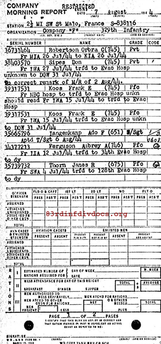 | rivate Sipes was a member of F Company. The morning report for July 27, 1944 on page 76 lists him as lightly wounded in action and transferred to an unknown evacuation hospital. The morning report for August 7, 1944 on page 16 lists his status changed to died of wounds on July 31, 1944. We note that this date does not match the date of ABMC which is July 28, 1944. All relevant pages can be seen below. |