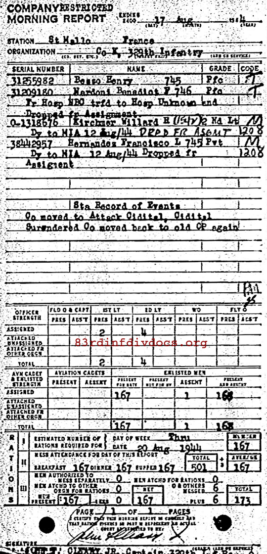 | Private Hernandez was a member of K Company. The morning report for July 27, 1944 on page 88 lists him as severely wounded in action and transferred to an unknown hospital. Page 90, for July 29, 1944 shows him returning to his unit. The morning report for August 17, 1944 on page 39 lists him as missing in action on August 12, 1944. All relevant pages can be seen below. |