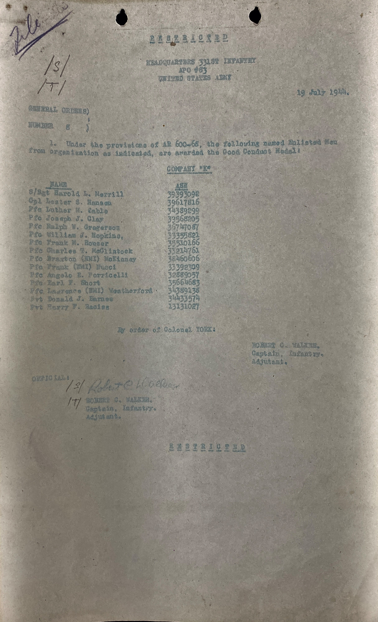 | 1944-08-15 | PFC | Killed in action on July 13, 1944, which corrects MR of August 7, 1944 | 746 | K / 331 | view page |