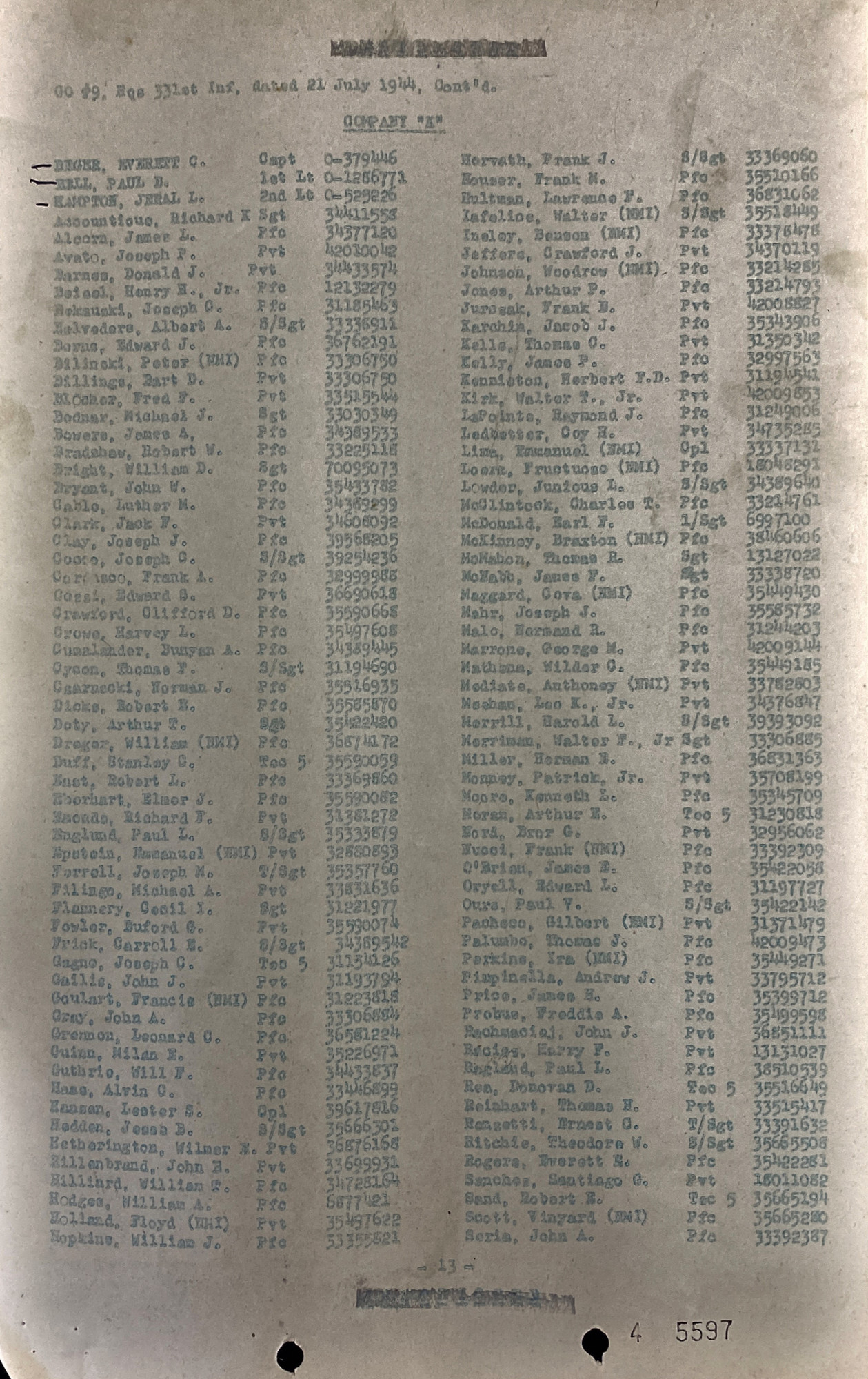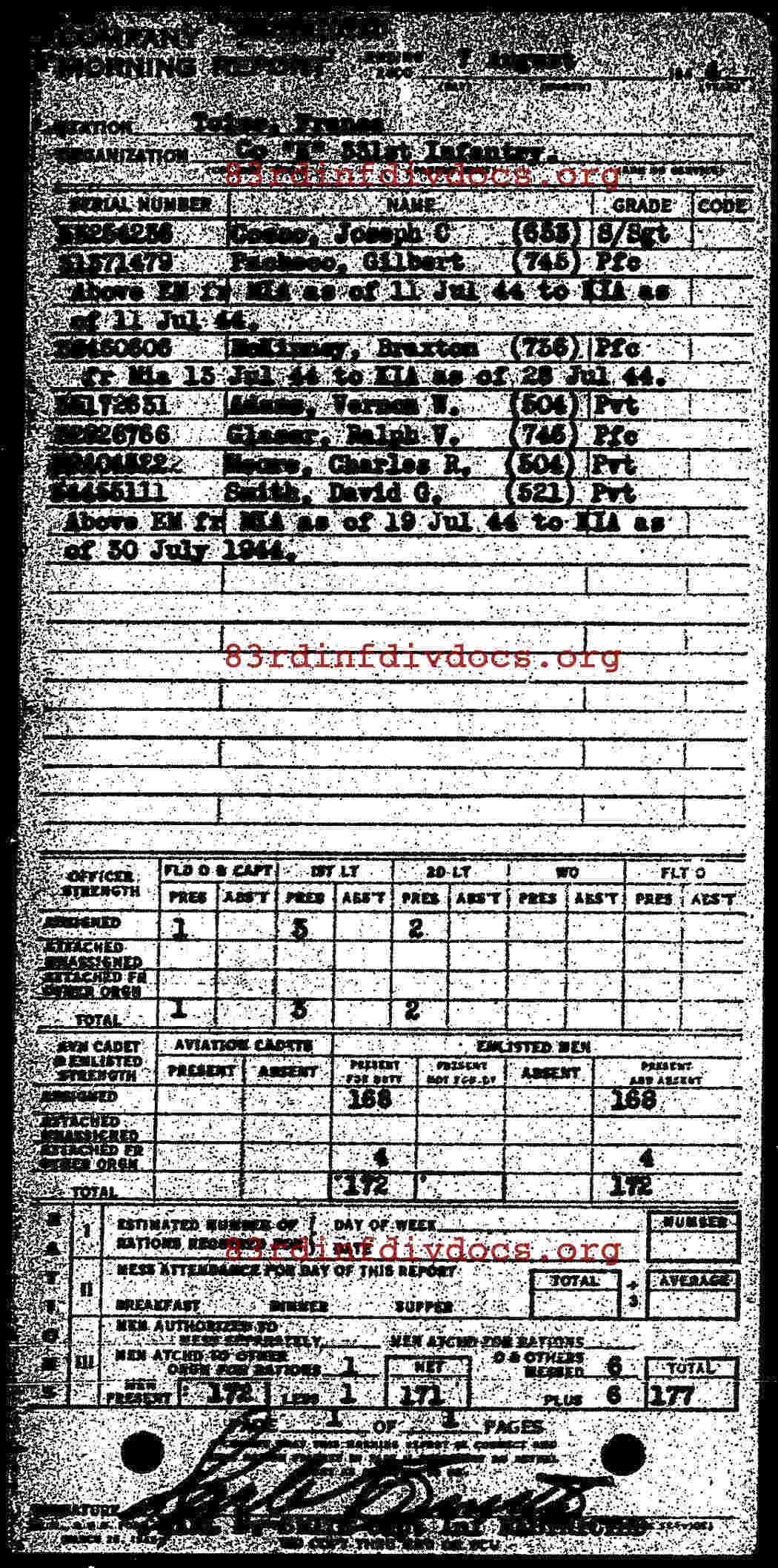 | 1944-08-07 | PFC | Killed in action on July 28, 1944 | 746 | K / 331 | view page |